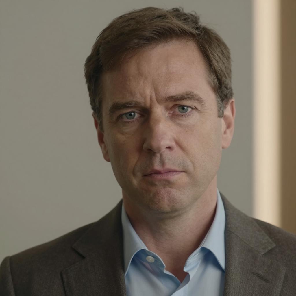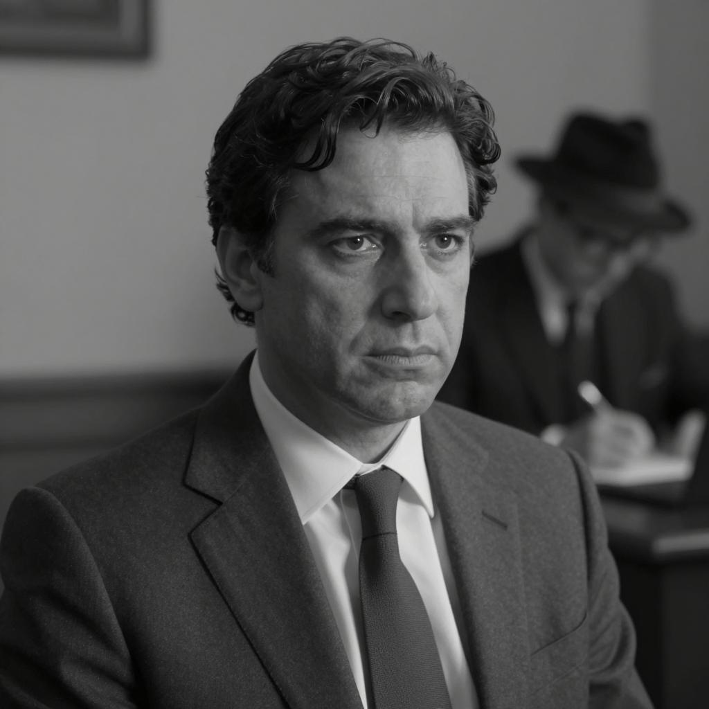 Two men in an office. Right man with gray hair, brown suit, white shirt, patterned tie, intense expression, leaning forward. Left man with brown hair, brown suit, white shirt, turned away. Old computer monitor with blue screen in background. Right man in foreground, left man in background.