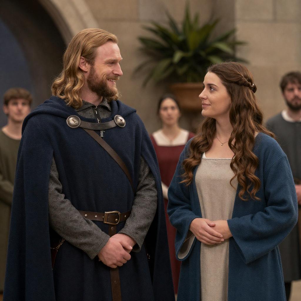 Photograph of a snowy medieval market scene. Two men in rustic, layered clothing. One stands, gesturing, wearing a blue coat; the other kneels, holding wooden objects. Background has hanging dried goods, red curtains, and wooden panels. Snowflakes fall, visible in foreground. Other people with wool hats in the bottom left. Intense expressions on standing man's face.