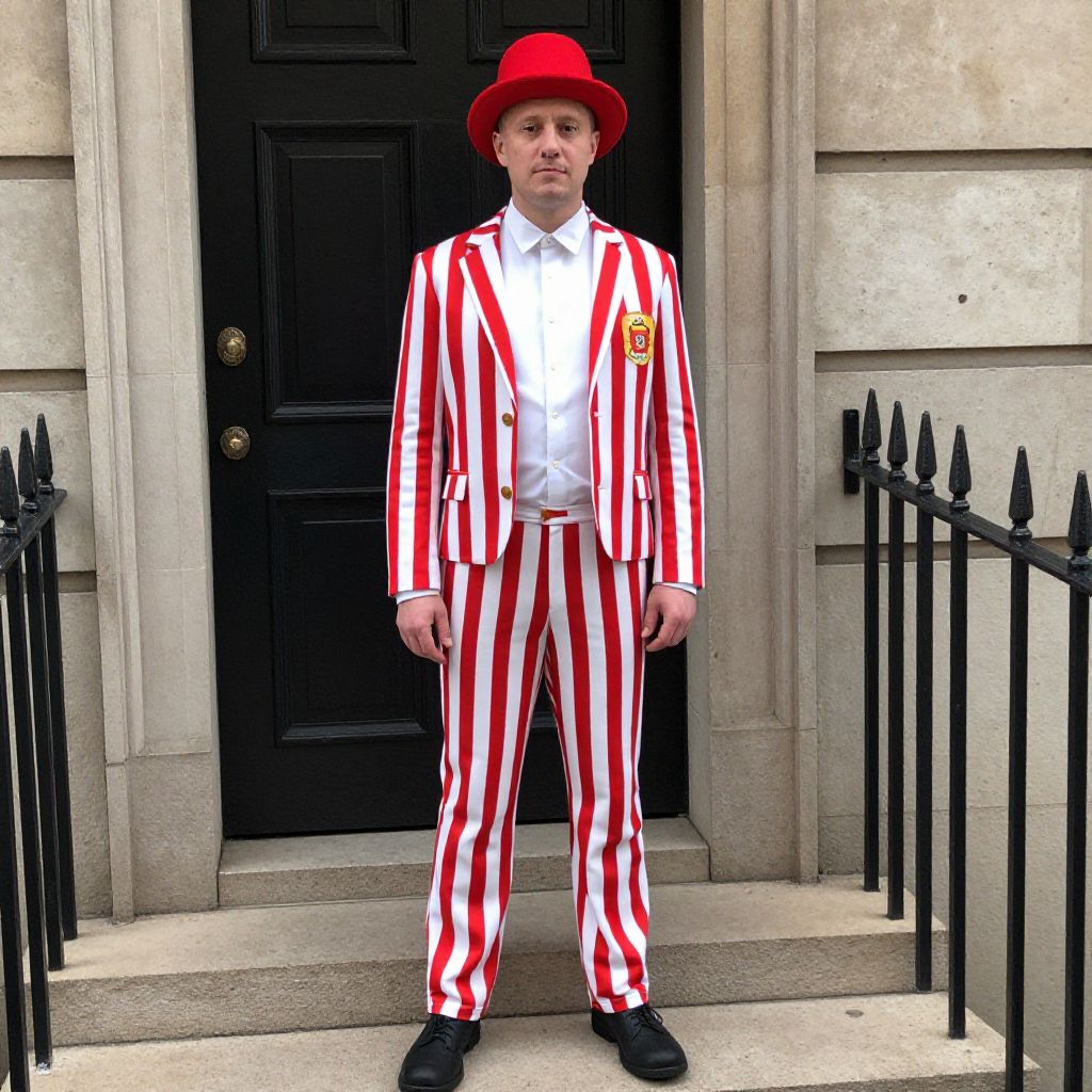 Photograph of a man in a red and white striped suit, white shirt, red hat, standing in front of a black door with black iron rail