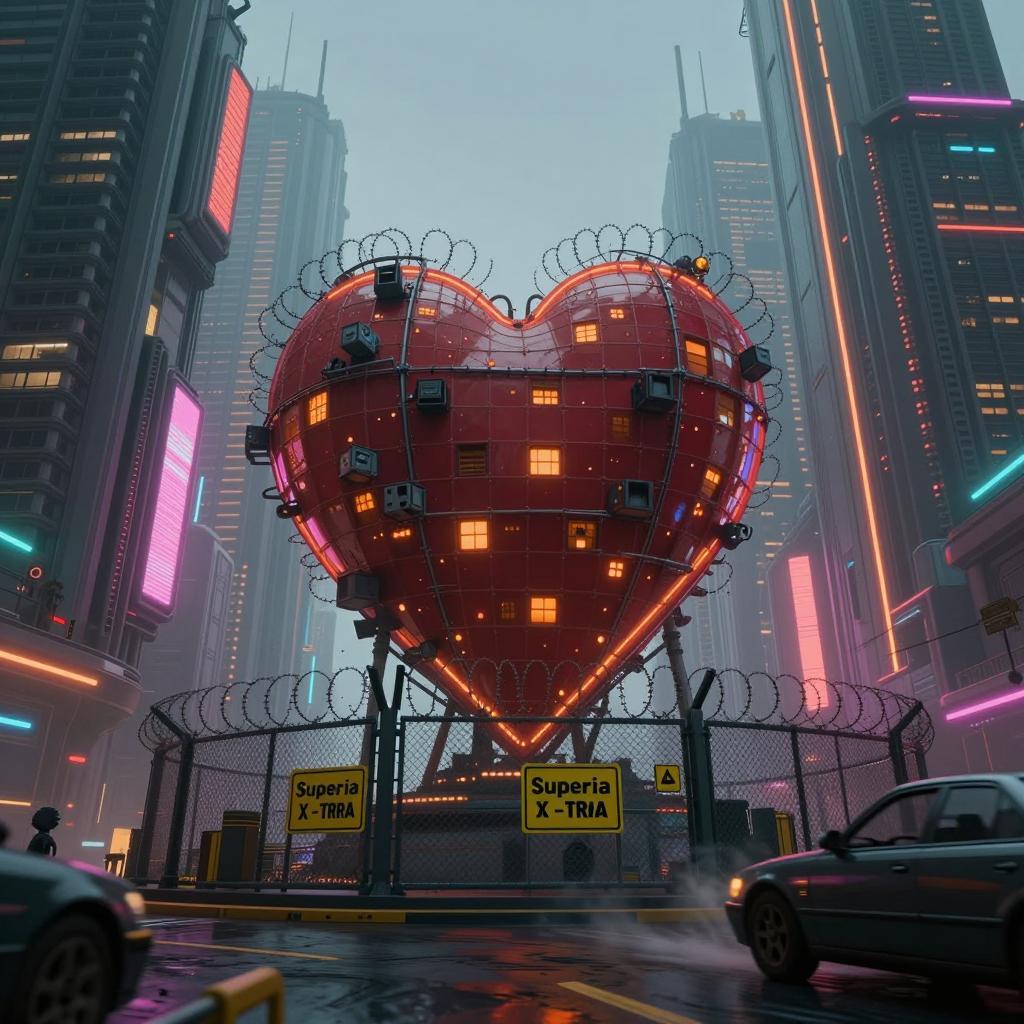 A photorealistic image of a futuristic dystopian cyberpunk cityscape featuring tall neon-lit skyscrapers. In the center is a prominent heart-shaped building illuminated with orange ambient lights, enclosed by barbed wire fencing and caution signs labeled 'Superia X-TRIA'. The scene includes wet streets with cars and atmospheric lighting effects, captured in a low angle shot to emphasize the scale and detail of the architecture in this urban environment.