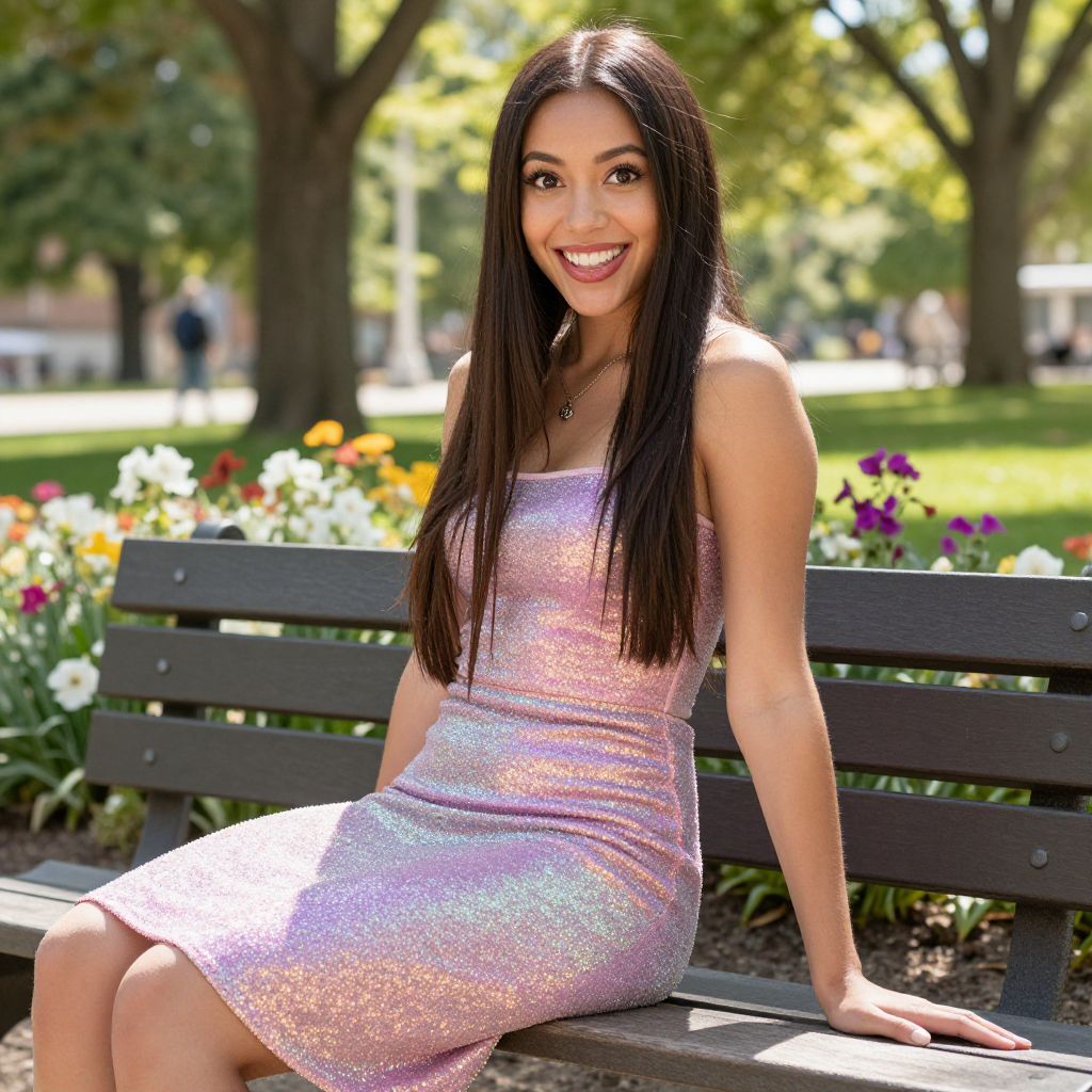 A diverse woman with long straight brown hair and wide, smiling eyes wearing a shimmering glitter skirt in pastel pink and purple tones, posed on a sunny park bench in a summer afternoon, with flowers blooming in the background and sunlight filtering through the trees.