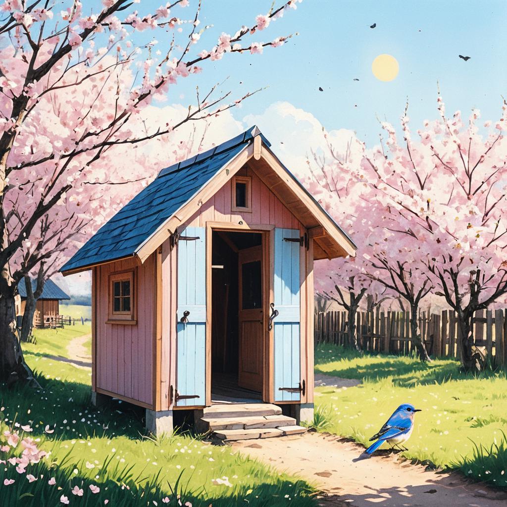 A small wooden house with a light blue door and a dark shingled roof located in a green countryside. A vibrant bluebird is perched on the roof above the door. Surrounding the house are multiple cherry blossom trees in full pink bloom under gentle sunlight and a clear sky.