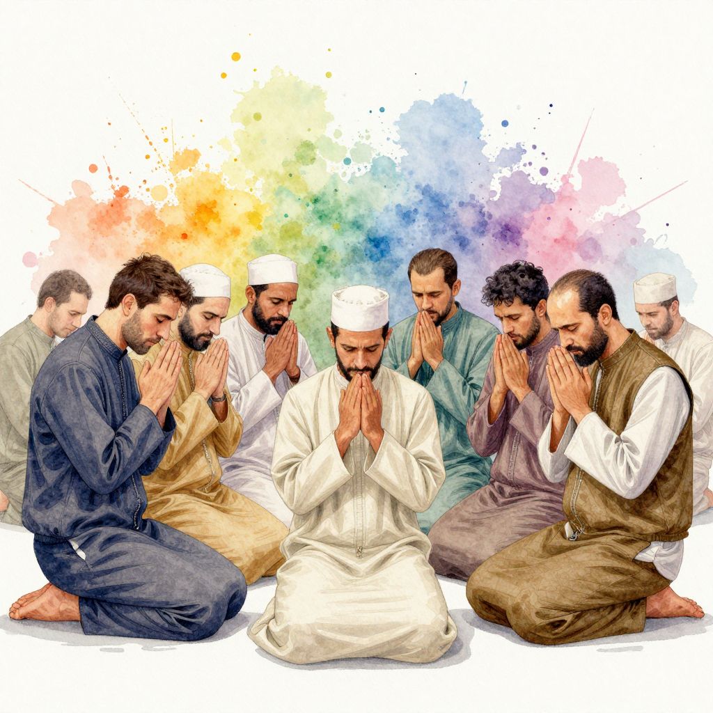 This digital illustration depicts ten men of Middle Eastern descent, wearing traditional Islamic attire, sitting on the ground in a circle with hands raised in prayer. The men have various beards and mustaches, and most wear white or light-colored caps. The background is a vibrant watercolor splash of rainbow colors, adding a spiritual and colorful atmosphere. The men are dressed in loose, long-sleeved garments in shades of white, brown, blue, and gray. They are all barefoot, focused and serene, with closed eyes. The illustration uses a semi-realistic, colorful style with visible brushstrokes and a mix of soft and bold colors.