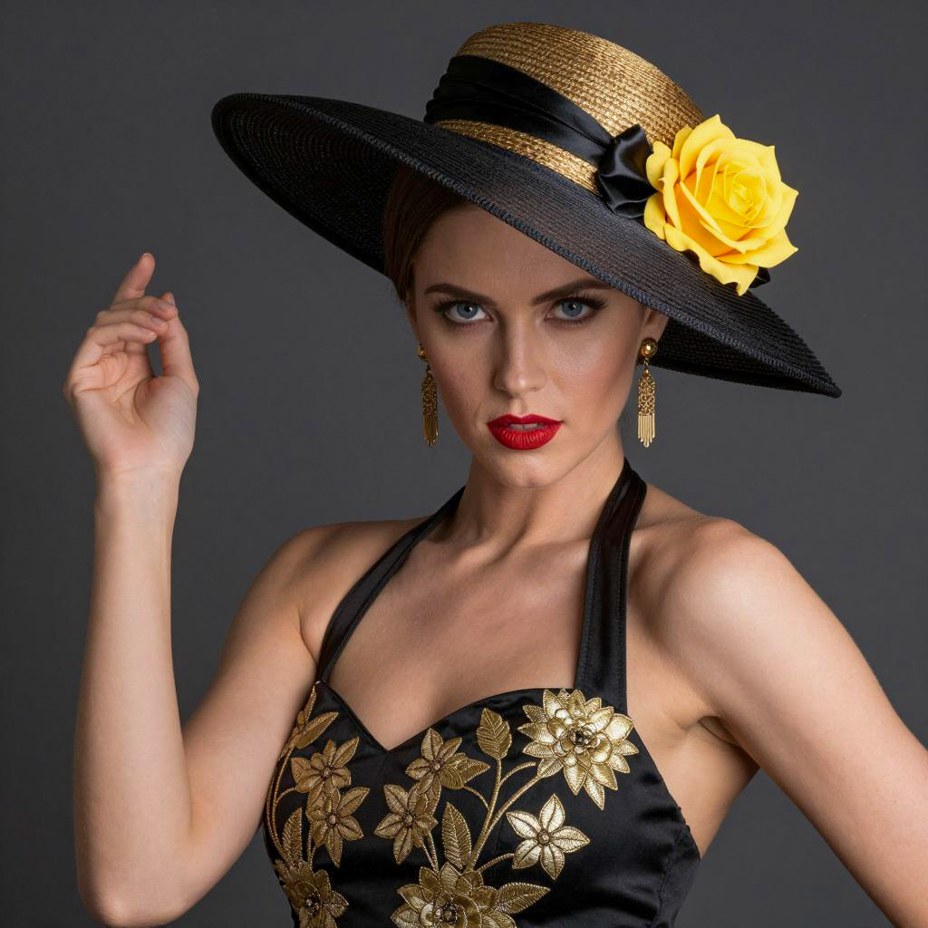 Photograph of a fair-skinned woman with intense gaze, wearing a black halter dress with gold floral embroidery. She has red lipstick, blue eyes, and a large black and gold hat with a yellow rose. She wears dangling gold earrings. Her right arm is slightly raised. Dark gray background. Upper body view.