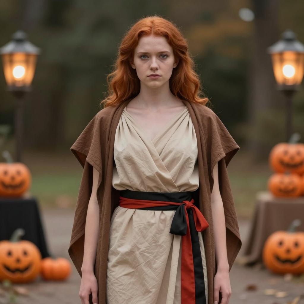 Hermione costume, photograph of a young woman standing on a tree-lined pathway, full body shot, natural light, daytime, summer, wearing a maroon dress with brown belt, light gray long-sleeve shirt underneath, brown leather boots, brown leather backpack, long red hair, green leafy trees in background, blurred path, brown brick building on the left, green bushes on the right, casual style, neutral expression, standing with arms relaxed by her sides, outdoors, park setting