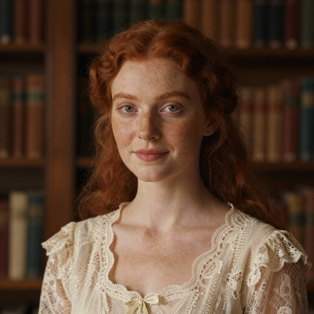 Portrait of a red hair green eyes woman with freckles, wearing vintage lace dress, warm natural lighting, softly blurred background of an old library, delicate facial features, subtle smile, artistic realism style with painterly textures