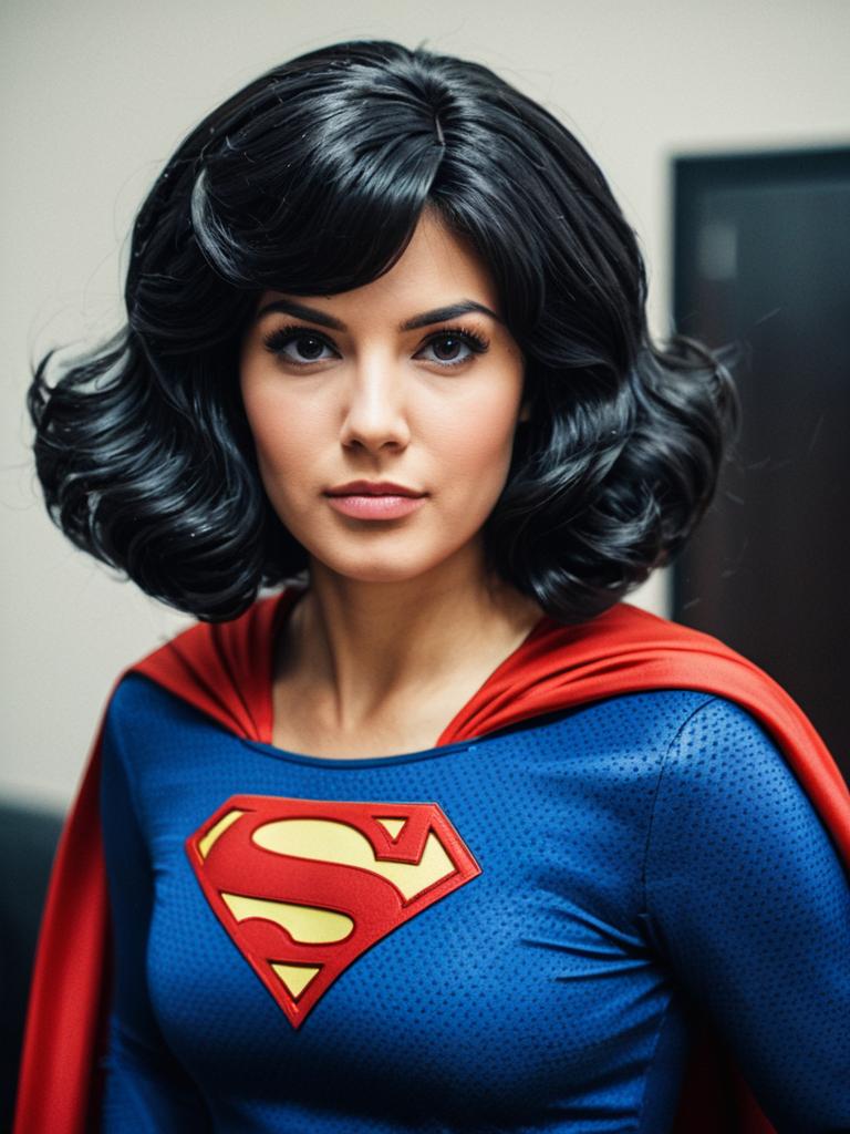 Superhero Wig Costume, a close up of a woman in a superman costume posing for a picture