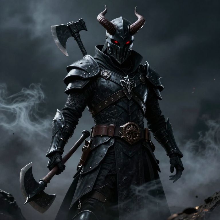 A dark, devilish figure in black assassin armor, holding an axe, with red eyes and helmet horns, stands in a dramatic, smoke-filled, dark sky, reflecting the Devilish red eyes, with a focus on realism and hyper detail, created using Unreal Engine 5.