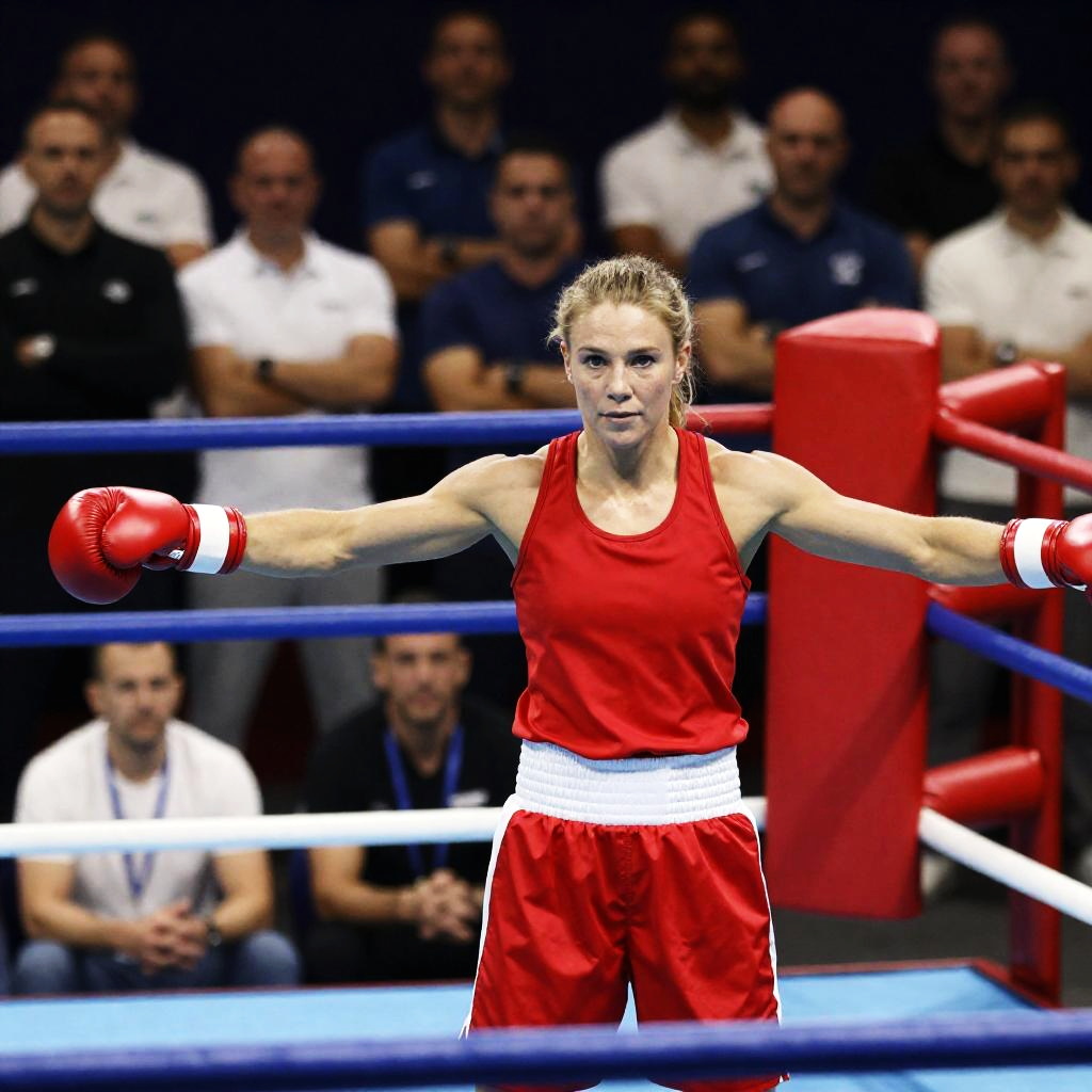 Photograph of a female boxer standing in a boxing ring, wearing a red tank top, red boxing shorts, and gloves. She has light skin, blonde hair in a ponytail, and a confident expression. She stands with arms outstretched on the ropes. Background has a diverse group of 15 people, some standing, some sitting, watching. The ring has blue ropes and a red corner post. Boxers' corner pad is visible behind her.