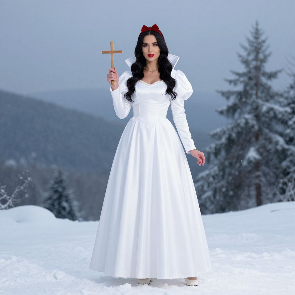 Snow White Woman Costume, a woman dressed in white standing in the snow with a cross