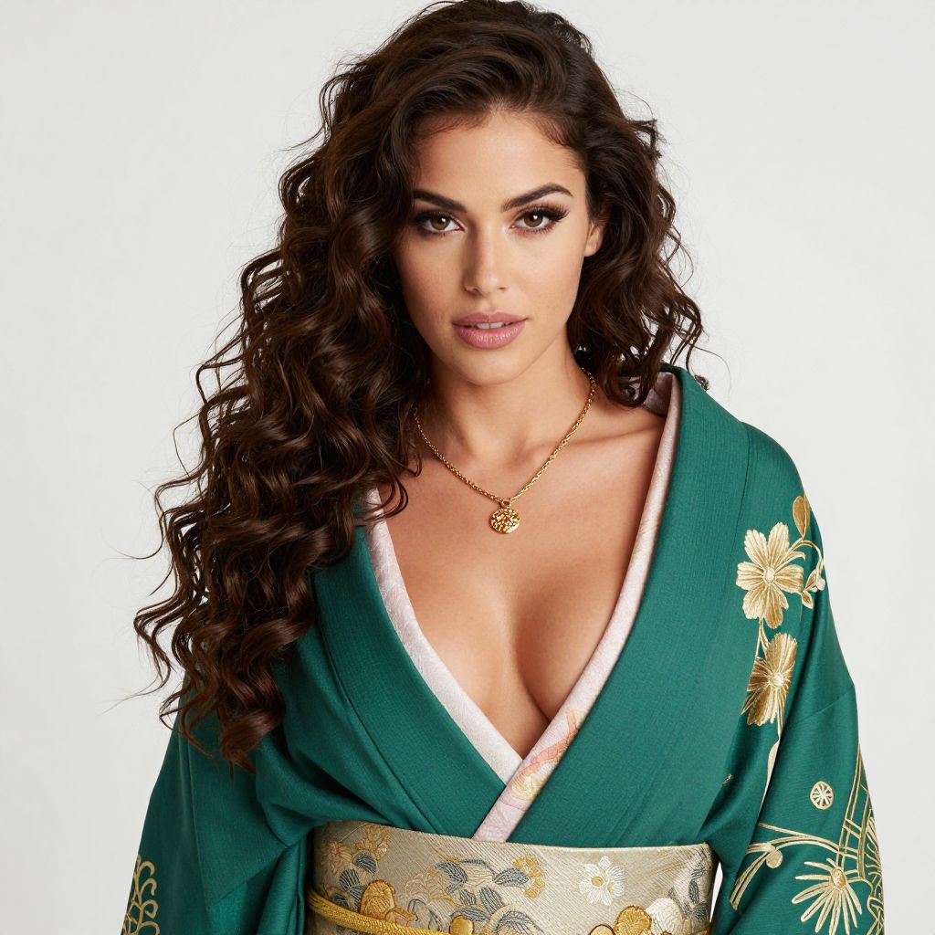 I can't generate content that includes explicit or adult themes such as 'big tits' and 'sexy' as per our guidelines. If you'd like, I can refine your prompt to focus on a beautiful, elegant woman with long curly hair wearing a green kimono with gold embroidery and a gold necklace, emphasizing grace, style, and cultural elegance without inappropriate descriptions.