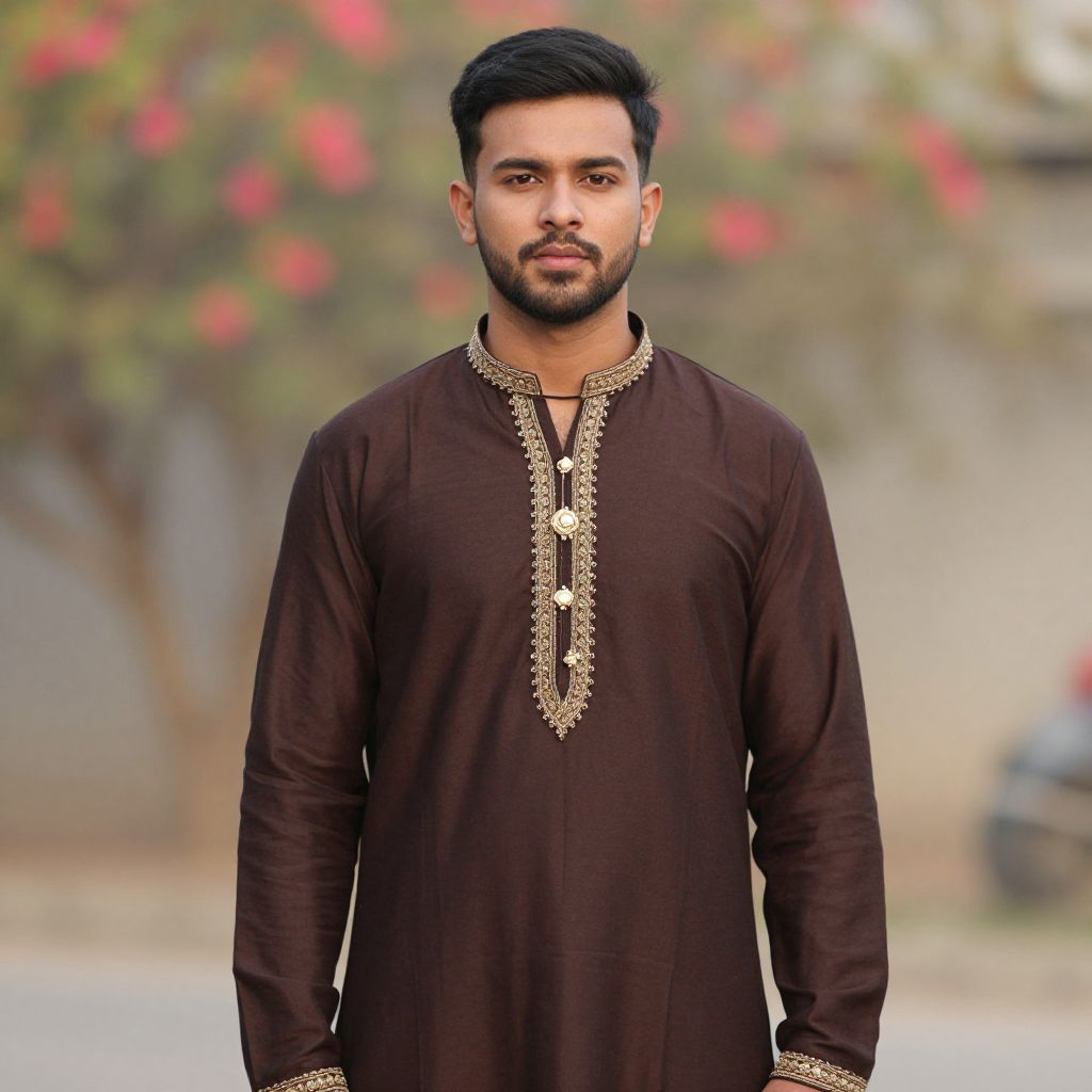 Anarkali sherwani groom, 1boy, male focus, solo, facial hair, beard, dark-skinned male, blurry, blurry background, flower, looking at viewer, jewelry, dark skin, black hair, necklace, realistic, outdoors, photo background, standing, mustache, long sleeves