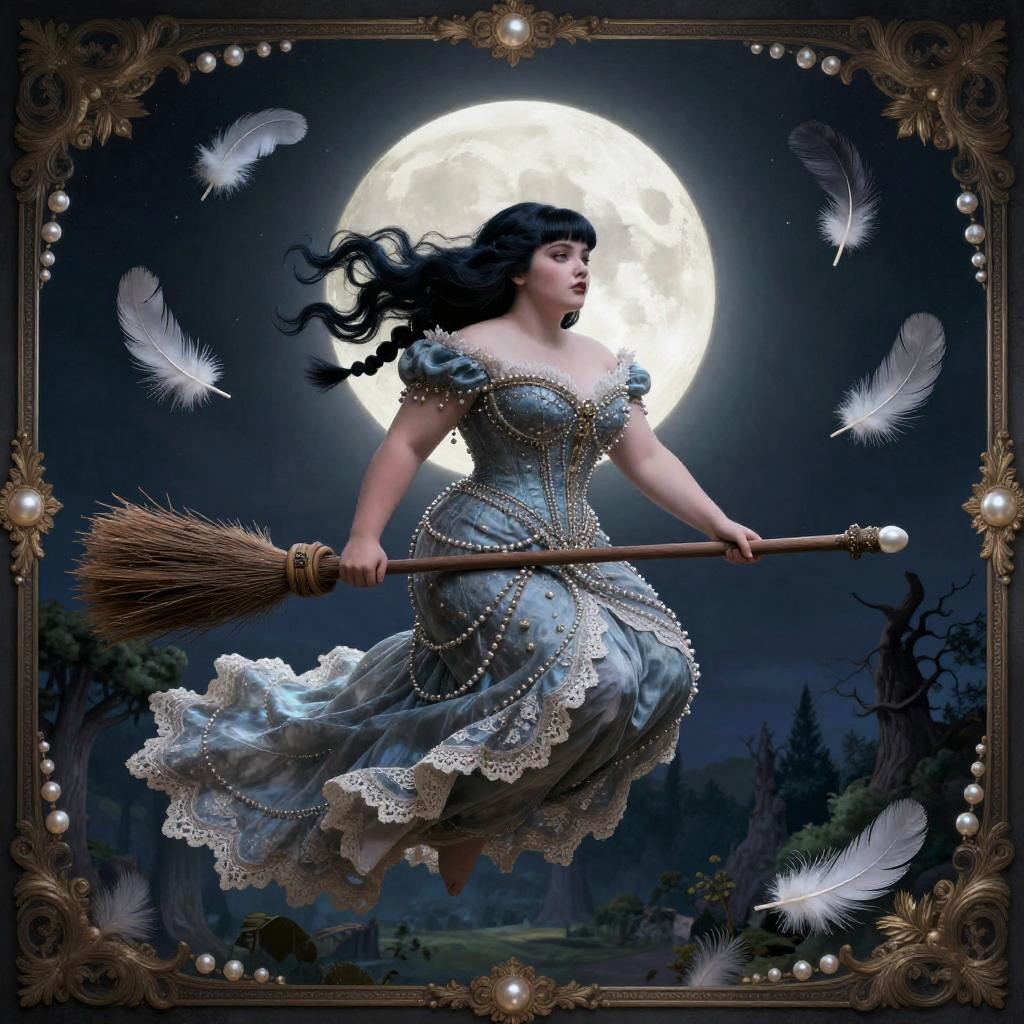 A whimsical, gothic fairytale illustration of a plump and magical woman with shoulder-length raven hair with blunt bangs and braided side tendrils, flying through a surreal night sky on a broom, surrounded by feathers and pearls, in front of a glowing full moon. She wears a voluminous beaded jacquard corseted gown with scalloped lace train with delicate lace and ornate details, framed by an elaborate vintage border. The scene is rendered in a highly decorative style with muted jewel tones and a mystical forest below.
