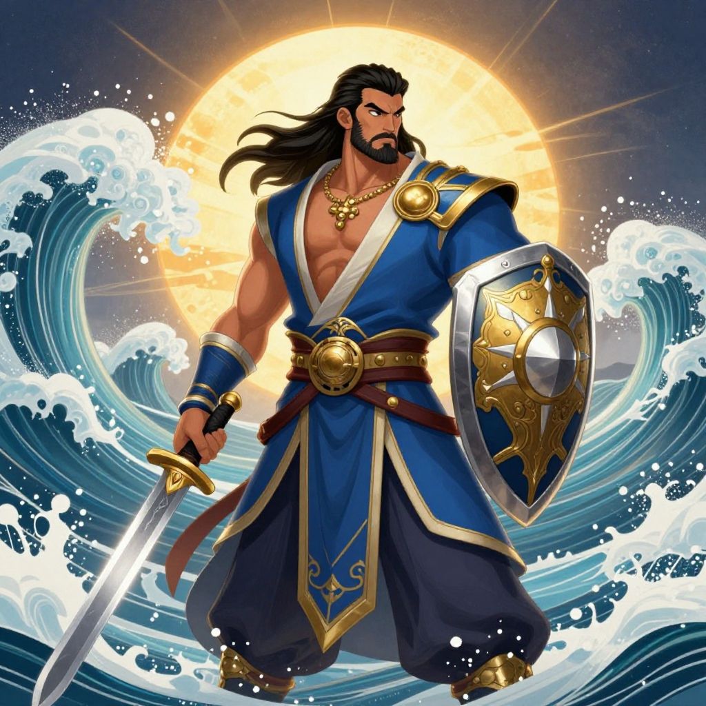 Detailed portrait-oriented pixel art of an ancient guardian standing in the ruins of a lost civilization at sunset. The scene features vibrant EGA colors with intricate dithering and anti-aliasing. The composition blends surreal fantasy elements with ornate architectural ruins and a large glowing sun in the background, evoking a mysterious and vintage tarot card atmosphere inspired by 1990s pixel art and Alphonse Mucha.
