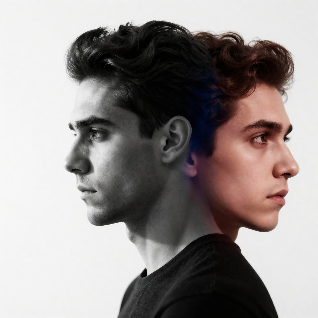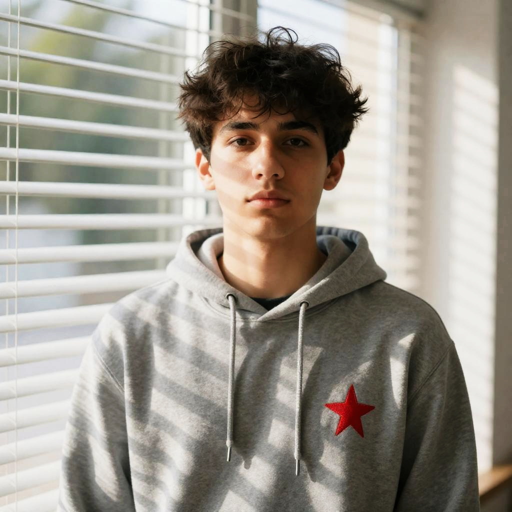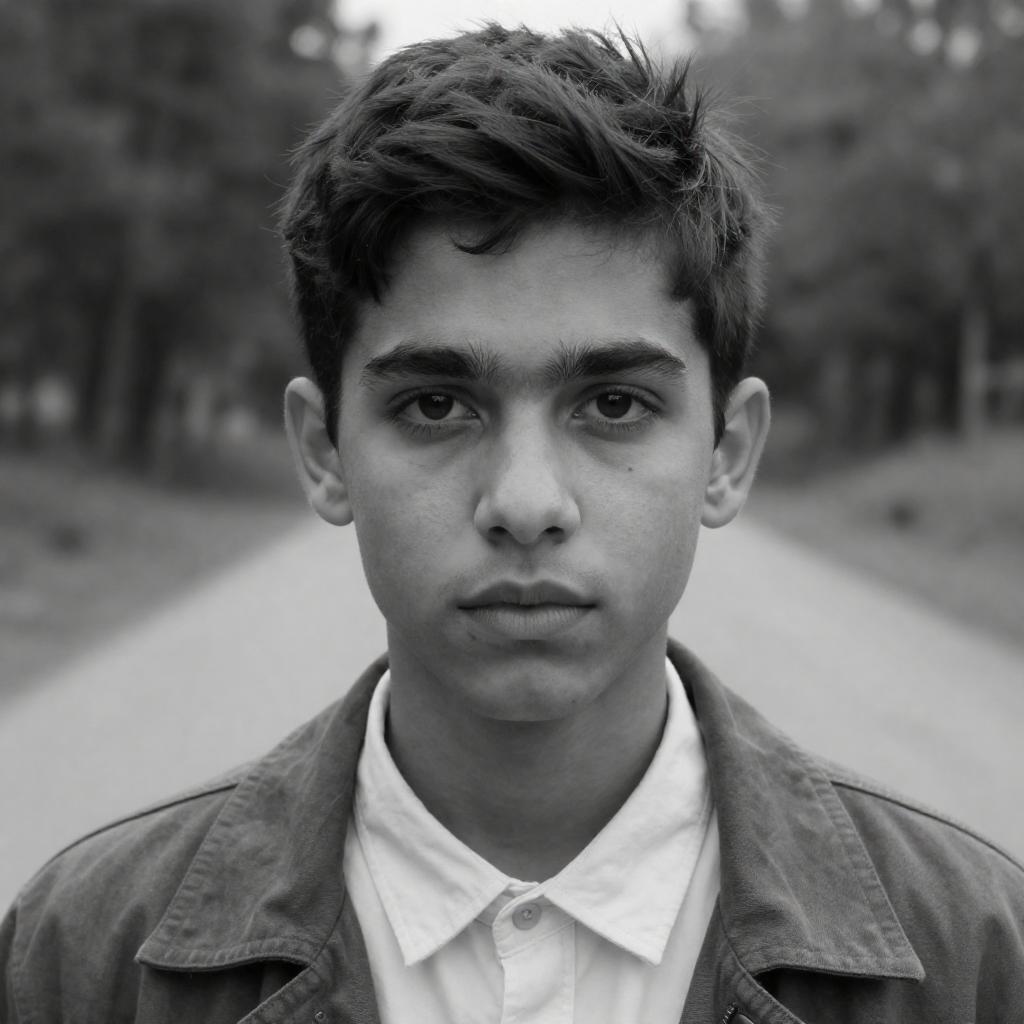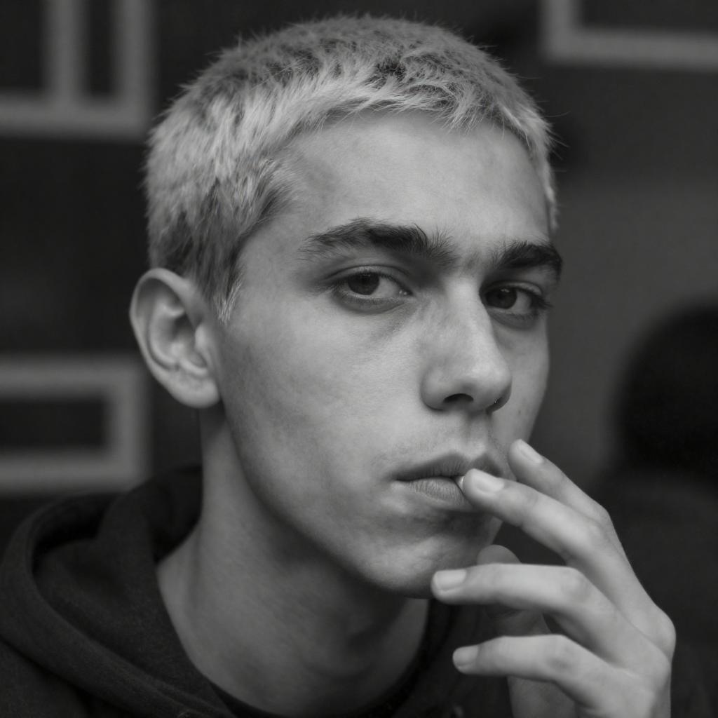 Black and white collage featuring urban street scenes with young adults. Central figure is a young man wearing sunglasses and a casual t-shirt standing on a city street. Surrounding images include close-ups of a person with a nose ring, a young man in a hoodie with a backpack, and various city buildings and street views. Red graffiti overlay adds a striking contrast to the monochrome photos.