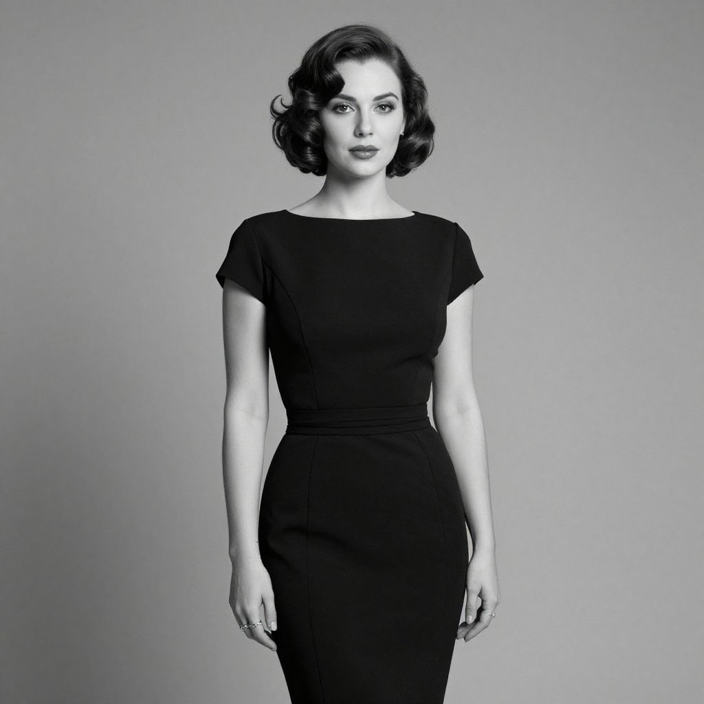 Black and white portrait of a poised woman wearing a fitted black midi dress with a cinched waistline and short, curled glossy brown bob hairstyle, styled in classic 1940s fashion. Minimal accessories including rings and a bracelet, with a refined and elegant look.