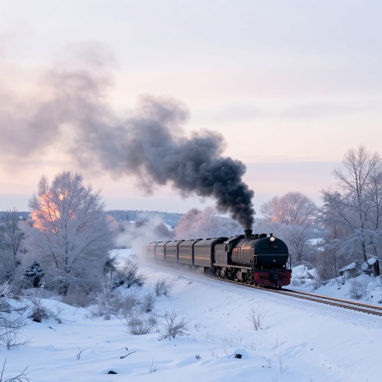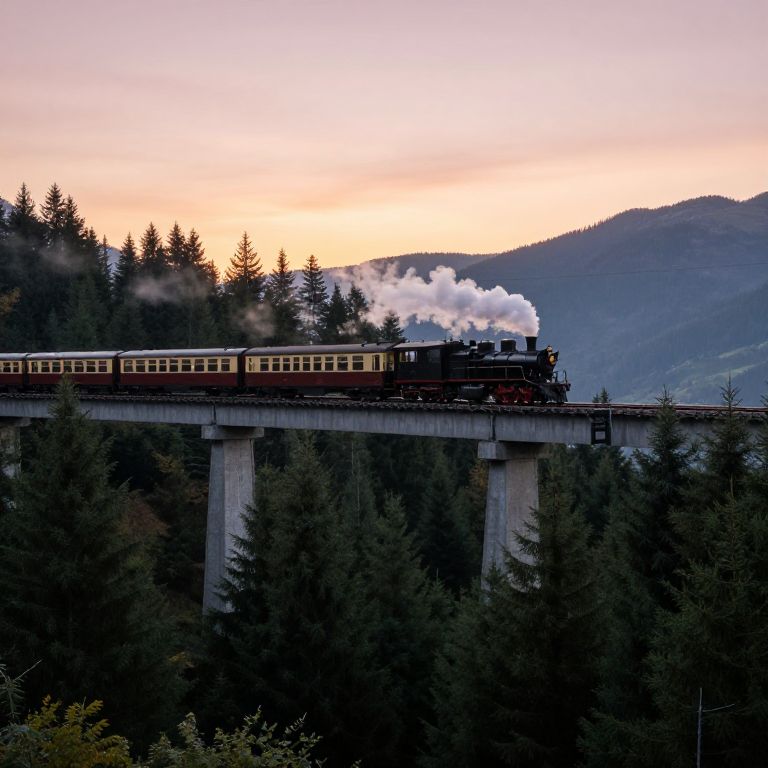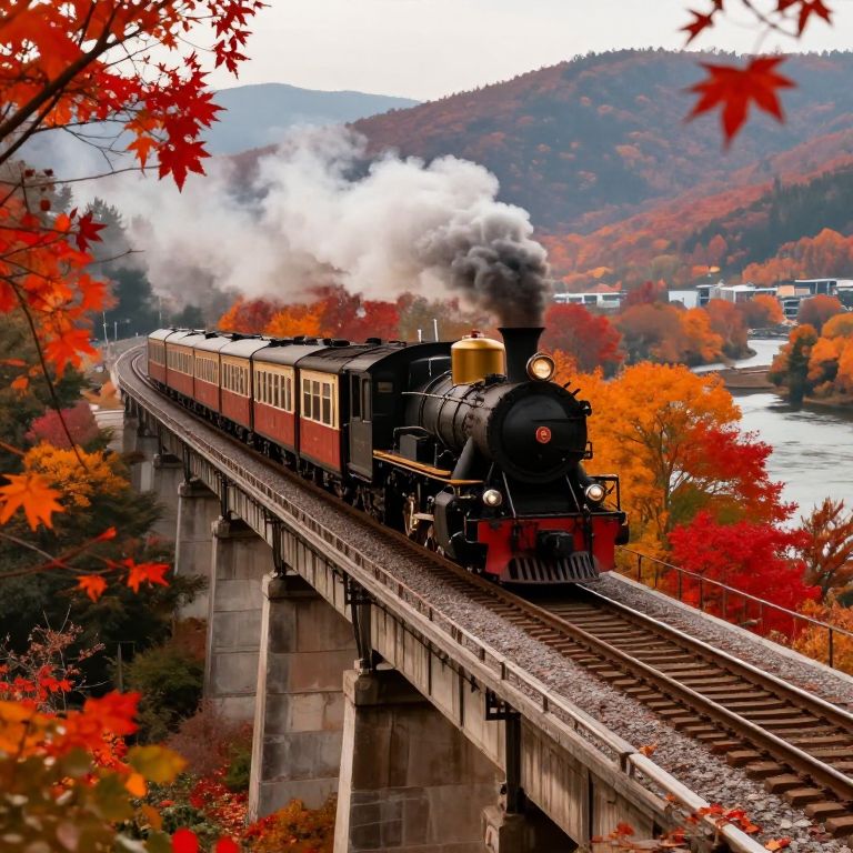 Pavitr steam train traveling over a long bridge during autumn, vibrant red and orange leaves surrounding the railway, smoke billowing from the engine, warm and nostalgic atmosphere, mountains and rivers in the distance, photorealistic style with fine textures.