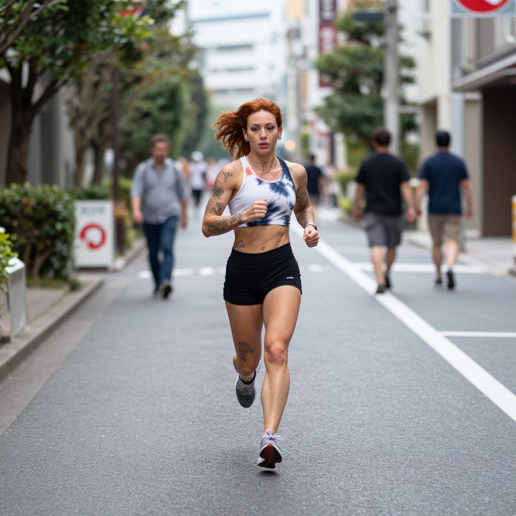 Tie Dyeing Super realistic photo, snapshot, distant view, distance view, irish woman, redhead, muscular, tattoo, Piercings, Tokyo, running, - - q 2,