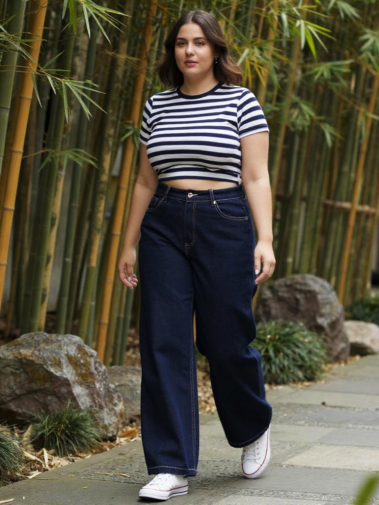 A Plus-size woman in casual chic attire, wearing dark wide-leg high-waisted jeans with contrast stitching and a striped crop top, strolls through a picturesque Zen garden with a bamboo grove. Her look is completed with white low-top sneakers, minimal makeup, and a simple hairstyle, all captured in the visual style of Juan Francisco Casas Ruiz. Sexy. Pretty face and beаutiful eyes. Big breasts