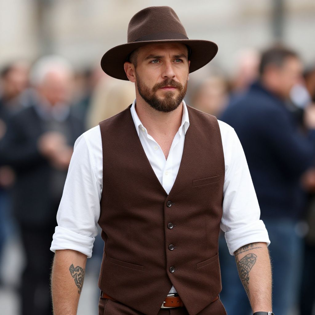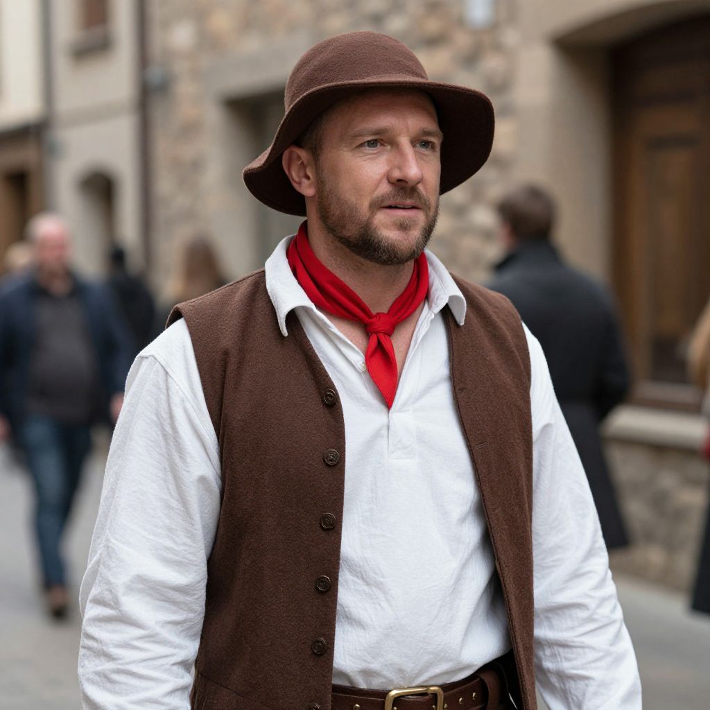 A man in a medieval costume is standing on a street. He is wearing a brown hat, a white shirt, a brown vest, and a red scarf around his neck.