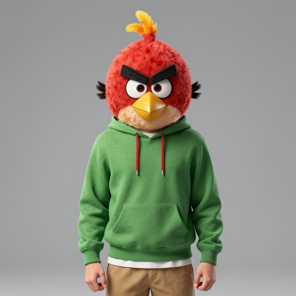 Young man wearing a realistic Angry Birds Red Bird character mask with yellow feathers and angry eyes. He is dressed in a green hooded sweatshirt with red drawstrings, a white t-shirt underneath, and tan pants. The image has a grey background and focused lighting, highlighting a casual outfit and digital photo style with a slight digital glow.