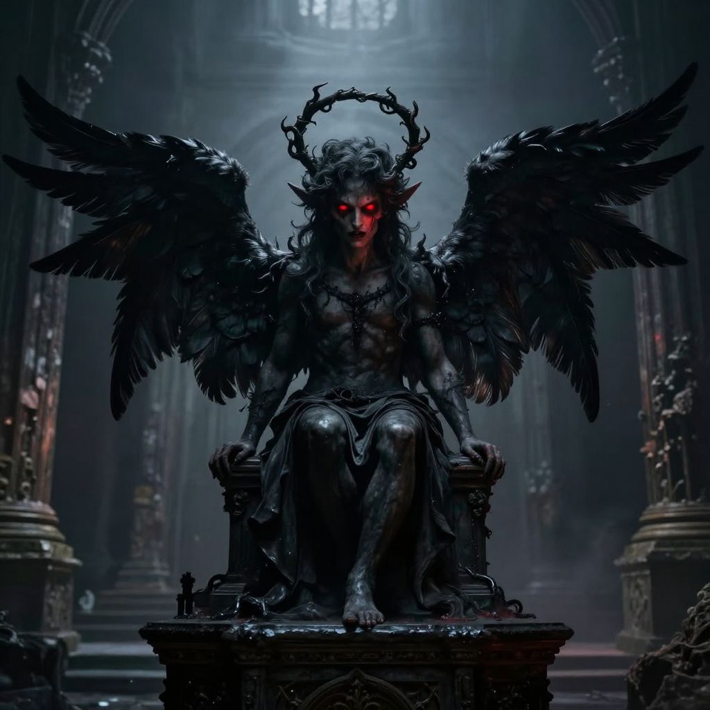 Evil cherub perched on a dark gothic altar, fluttering black feathered wings, glowing blood-red eyes, intricate twisted halo, surrounded by shadowy mist and ancient ruins, ominous atmosphere