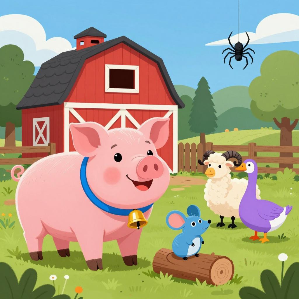 Digital illustration of a farm scene. Large pink pig with blue collar and gold bell, smiling, in foreground. Blue mouse on log, looking up. White ram with black horns. Purple goose with orange beak. Red barn with black roof in background. Spider hanging from sky. Green grass, trees, and wooden fence. Bright blue sky with clouds.