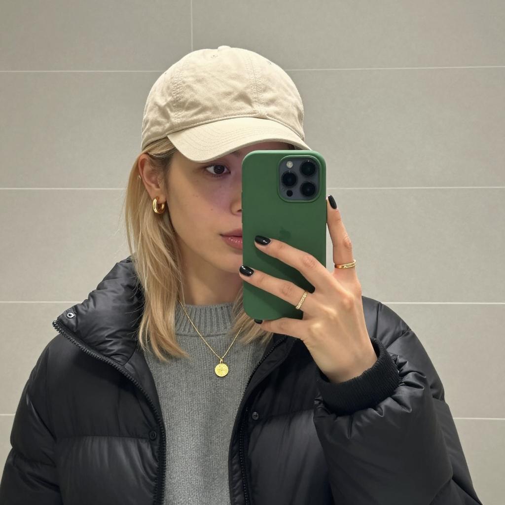 Blonde woman with high ponytail in elevator, wearing black letterman jacket with green "S", making peace sign with right hand, holding gold iPhone in left hand, taking mirror selfie, neutral facial expression. Stainless steel elevator walls.