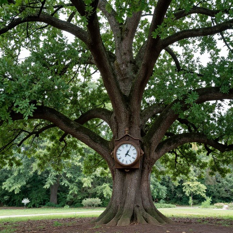 Time intertwines with nature in a serene embrace, as the clock's hands pulse rhythmically with the life force of the ancient tree, whispering the eternal dance of existence.