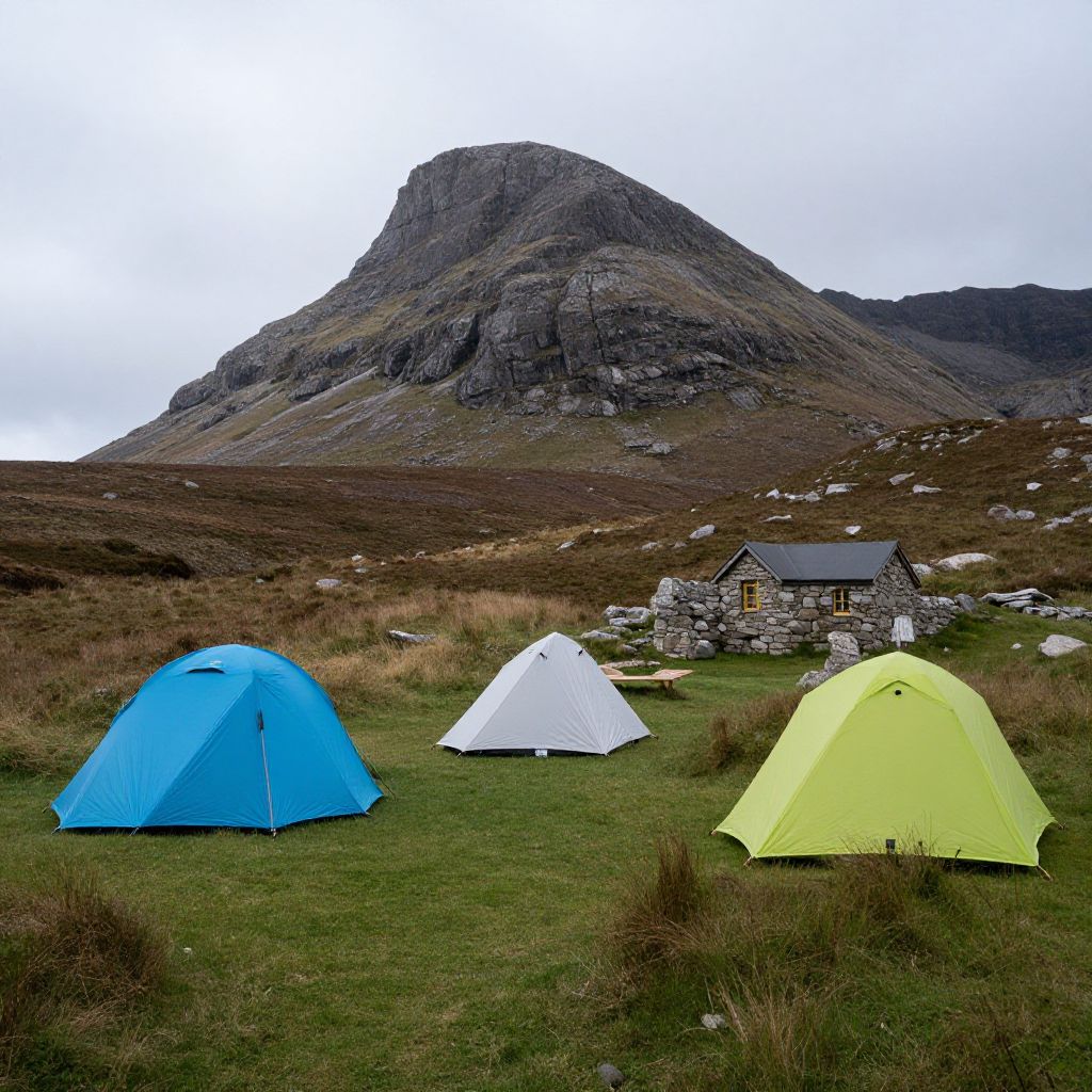 Photograph of a mountainous landscape featuring three colorful tents on a grassy field. A large, rugged mountain with dark gray and brown rocky textures dominates the background under a cloudy, overcast sky. In the mid-ground, there's a rustic stone house with a gray roof. The tents are positioned in the foreground: a bright blue tent on the left, a white tent in the center, and a yellow tent on the right. The grassy field is interspersed with patches of brown, rocky terrain and small white stones.
