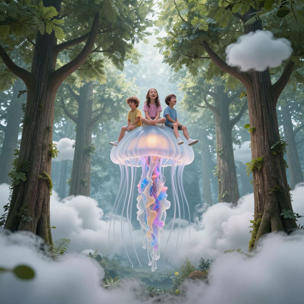 Amidst a surreal inversion of nature, children perch atop a giant jellyfish, their laughter echoing through the ethereal canopy of towering trees and drifting clouds, embodying the boundless wonder and freedom of childhood imagination.