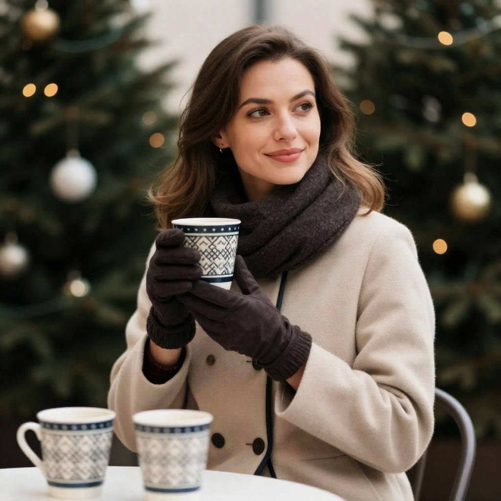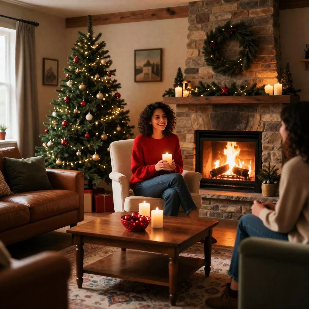 Blonde woman with wavy hair, white blouse, holding wooden candle holder, in cozy room. Table with candles, glass bottles, pinecones, lanterns, and red shelf in background. Candles lit, warm light. Woman's expression is focused. Multiple candles on table.