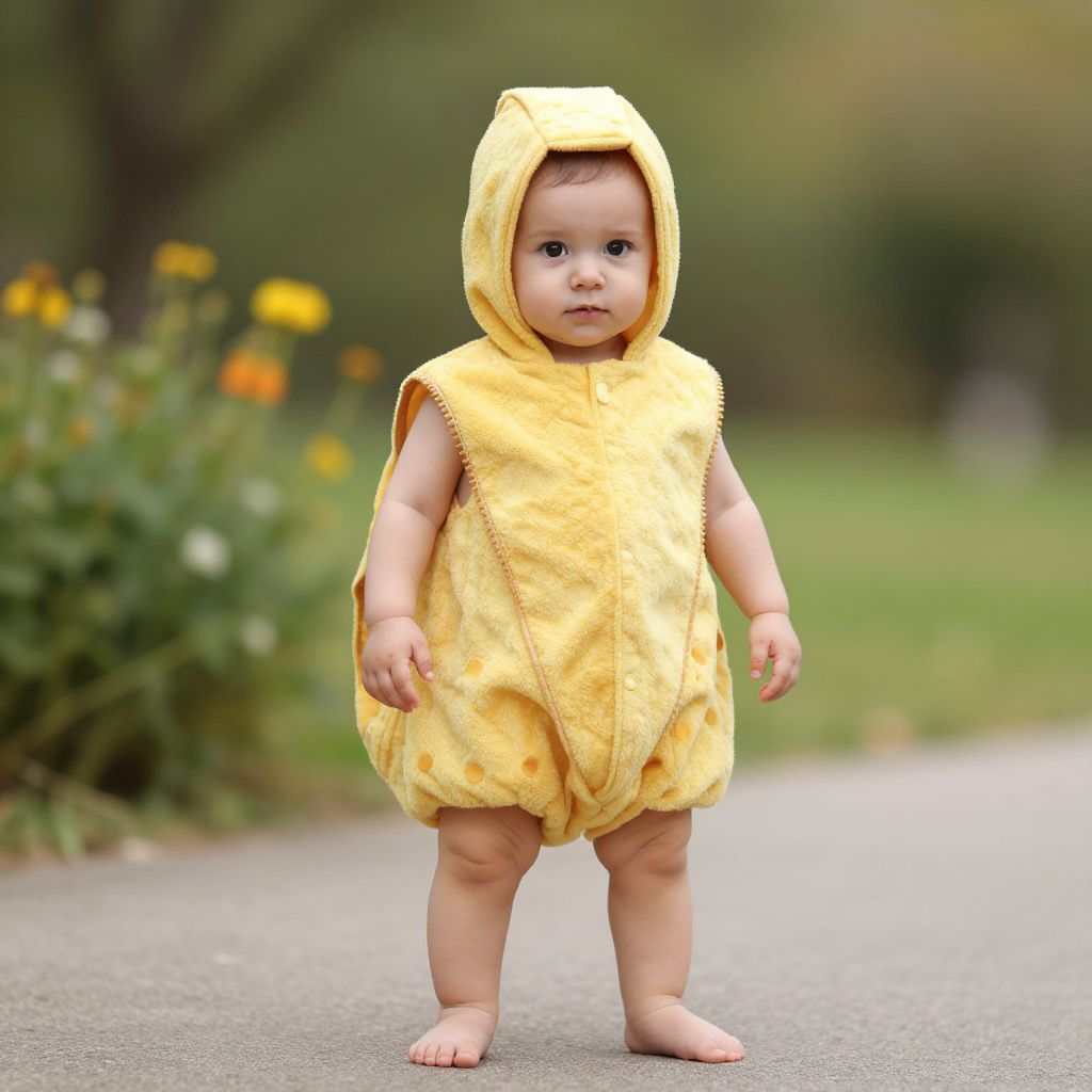 Photograph of a smiling baby standing outdoors on a paved path. The baby wears a bright red, fuzzy, hooded jacket with black polka dots, black antennae-like ears on the hood, and a white onesie. The jacket is open, revealing the white onesie underneath. The baby also wears black socks and black shoes. The background is blurred, showing green grass and trees, suggesting a park or garden setting. The baby's skin is light, and the expression is joyful with wide eyes and an open mouth. The overall image is vibrant and playful.