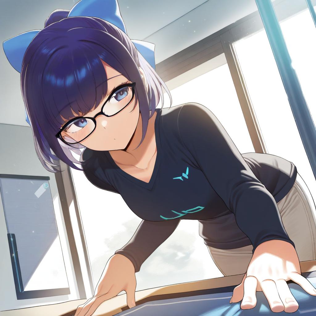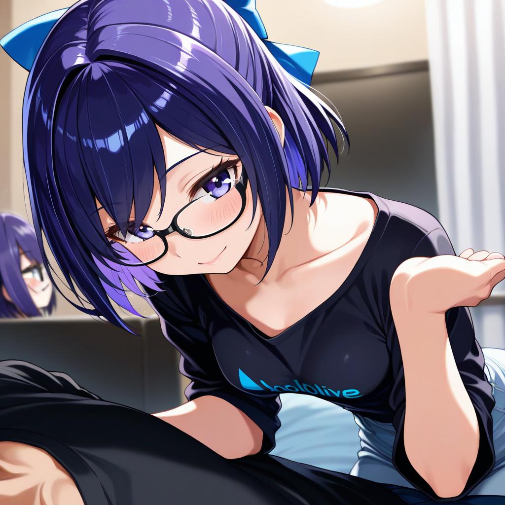 A-chan (hololive), hololive, 1girl, blue eyes, glasses, black-framed eyewear, short hair, blue hair, purple hair, swept bangs, hair bow, small breasts, collarbone, black shirt, blue bow, virtual youtuber, virtual youtuber, by artist q azieru, animagine