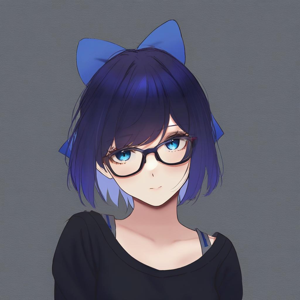 Digital anime-style illustration of a young female character with short purple-blue hair adorned with two blue hair bows. She has striking blue eyes and is wearing black-framed glasses. The character wears a black shirt with a visible collarbone and has a thoughtful expression, set against an abstract purple and white background. The art style is inspired by virtual YouTuber and anime aesthetics.