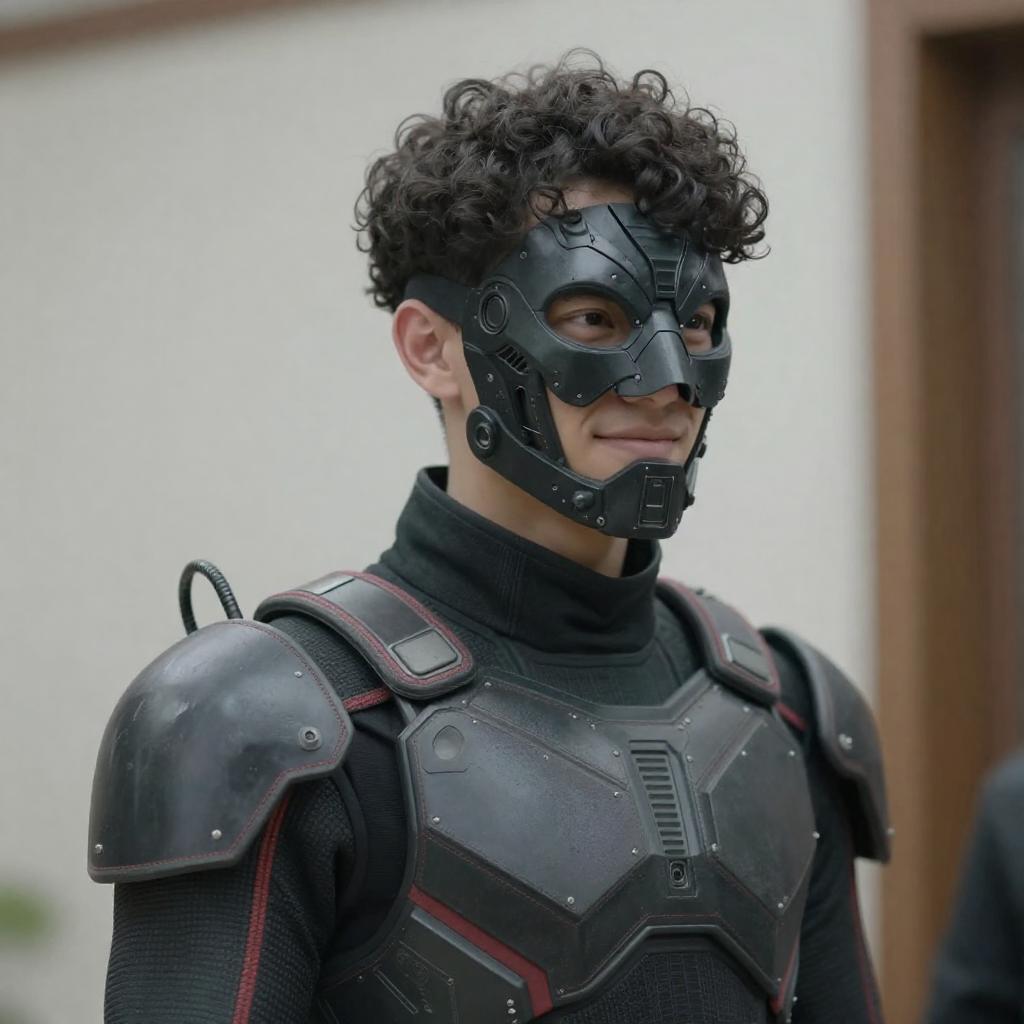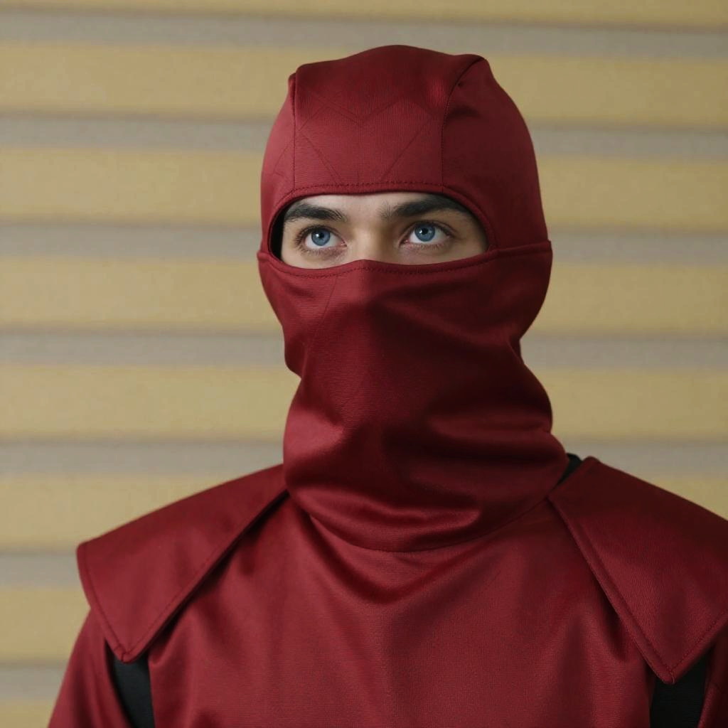 Close-up photograph of a person wearing a detailed, black, alien-like headpiece with numerous twisted, ribbed tubes. Their hand grips the headpiece, partially covering their face. Mouth open, showing sharp teeth. Red background. Intense, shadowed expression.