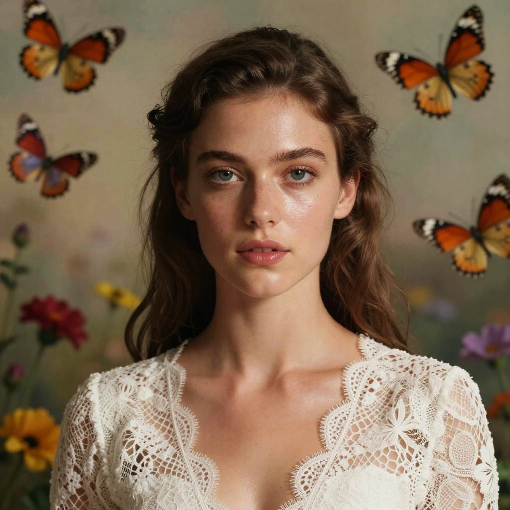 Close-up portrait of a young woman with detailed green eyes and natural shiny skin, wearing a white lace long dress. She stands against a blurred floral background with colorful butterflies around her, looking directly at the camera. Soft cinematic lighting enhances the realistic texture and delicate features of her face.
