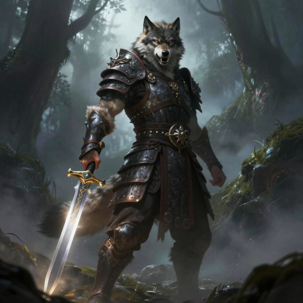 Half man half wolf warrior in ancient armor, holding a glowing sword, snarling face with sharp teeth, dense fog in mystical forest background, dramatic shadows, fantasy art style