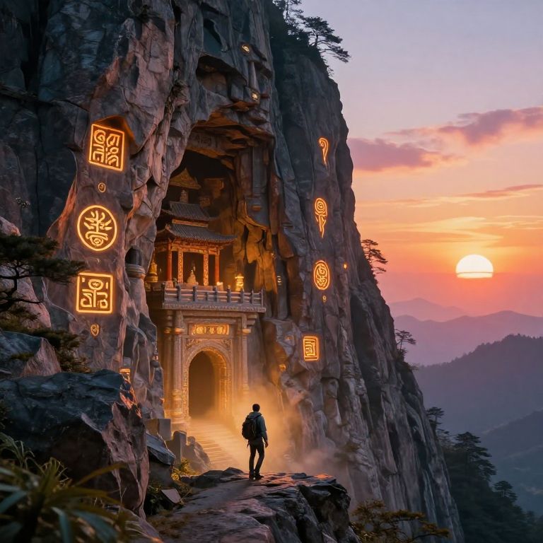 Photograph of a lone figure standing before a glowing, ancient temple carved into a towering cliff at sunset, illuminated by mystical symbols.