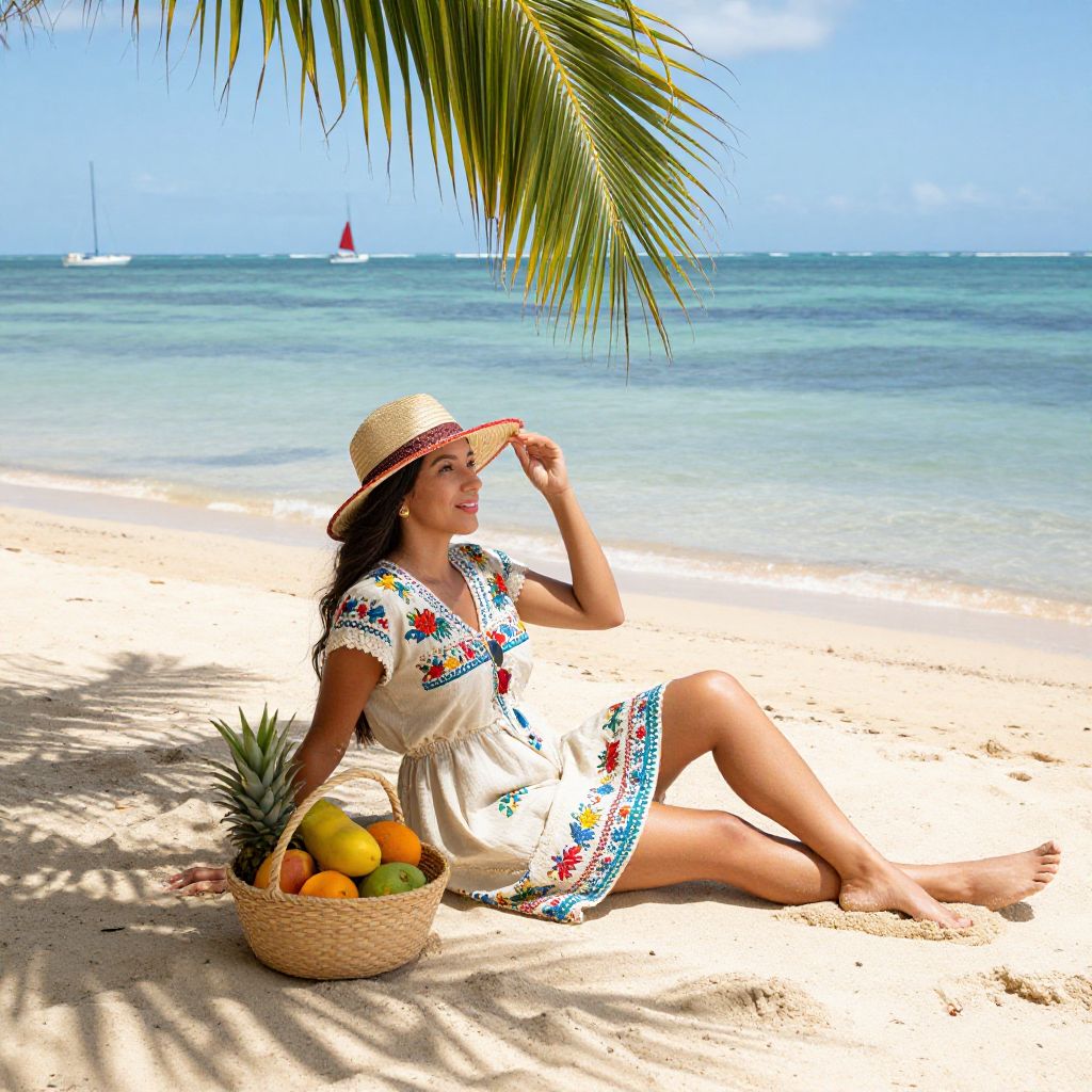 Mexican woman relaxing on a sandy beach at midday, wearing light embroidered dress and sunhat, holding a woven basket with tropical fruits, palm fronds casting shadows, crystal clear sea behind her with sailboats on horizon, bright and cheerful atmosphere.
