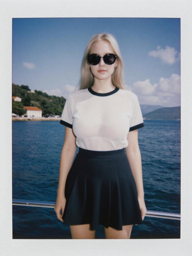 A hourglass woman in a casual chic outfit featuring a white mesh t-shirt with black trim and a black pleated mini skirt, accessorized with oversized round sunglasses and platinum blonde straight hair. Captured in a polaroid instant camera style, she stands on the Croatian coast from a yacht, the vibrant sea and sky framing her relaxed yet stylish look. Sexy. Pretty face and beаutiful eyes. Big breasts