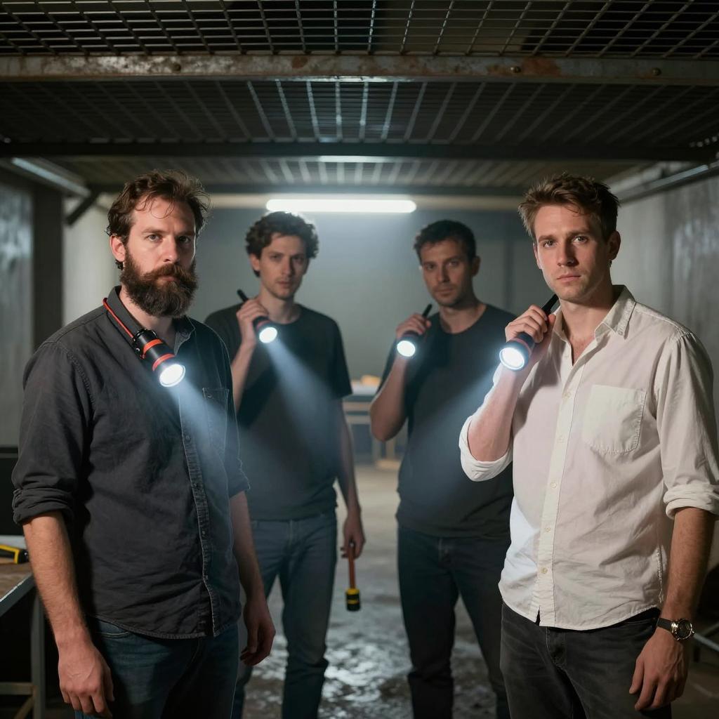 Four men with flashlights in a dimly lit, industrial, metal-grid ceiling space. Two men in front hold flashlights, one bearded with a mustache, the other with short brown hair. Two men behind hold tools. All wear dark clothing. Background has bright lights. Man in front wears a white shirt with rolled-up sleeves.