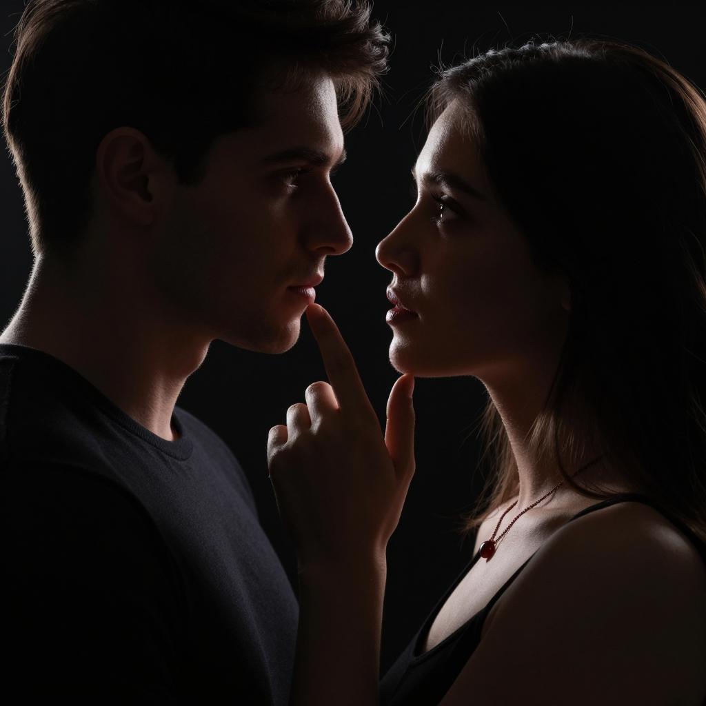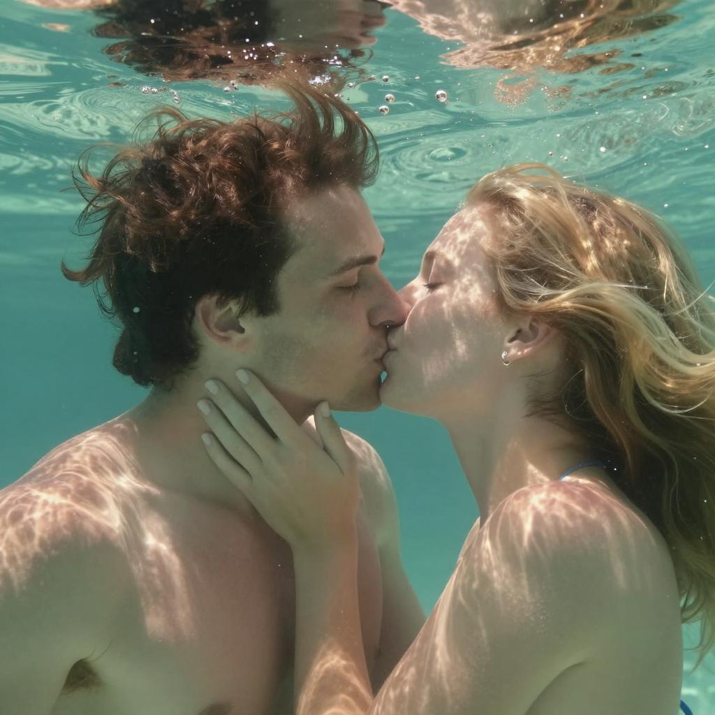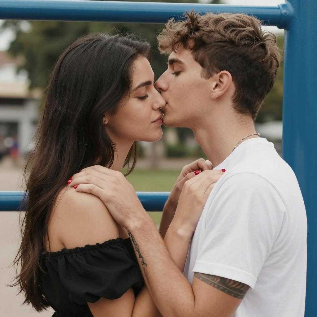 Young man with short brown hair, wearing white t-shirt, kissing woman's forehead. She has long dark hair, closed eyes, black off-shoulder top. He has tattooed arm, holding her hand. They are leaning against a blue metal structure. He kisses her left temple. Her nails are painted red, his right hand rests on her shoulder. Natural light, outdoor setting. Two people.