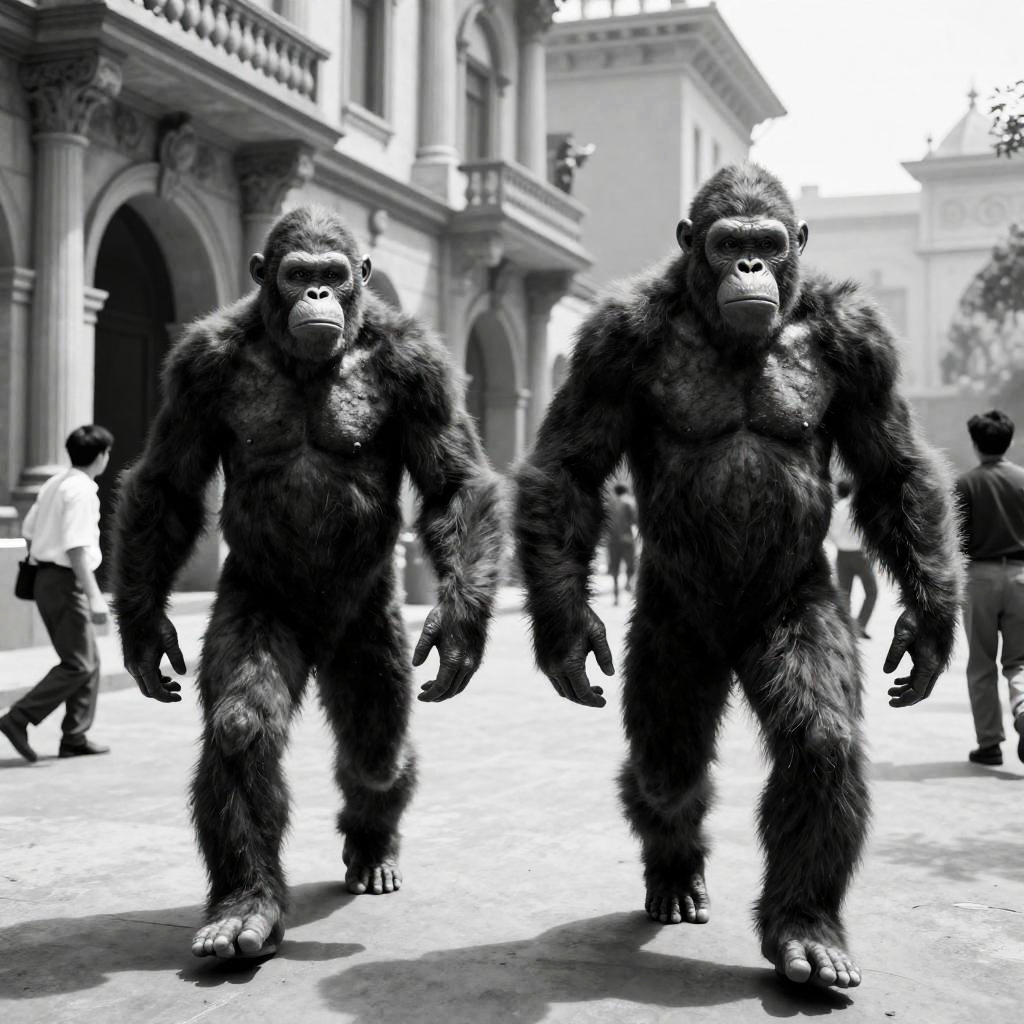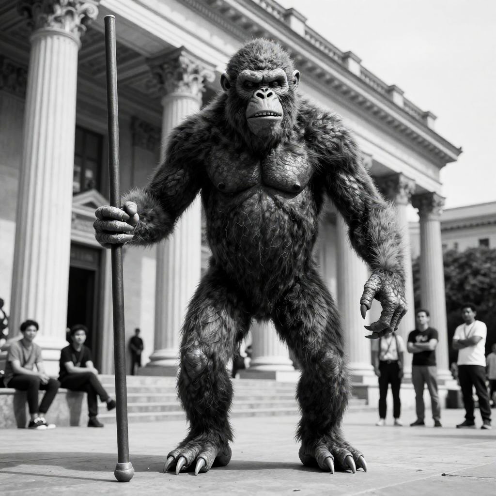 Black and white photograph of a monstrous, ape-like creature with ured, scaly skin and large claws. It stands on two legs, holding a long pole in its right hand. Background shows an ornate, classical building with tall columns. Several people sit and stand in the background, watching. Creature's face is fierce with a snarling expression. Scene is outdoors, with strong shadows and light contrasts.
