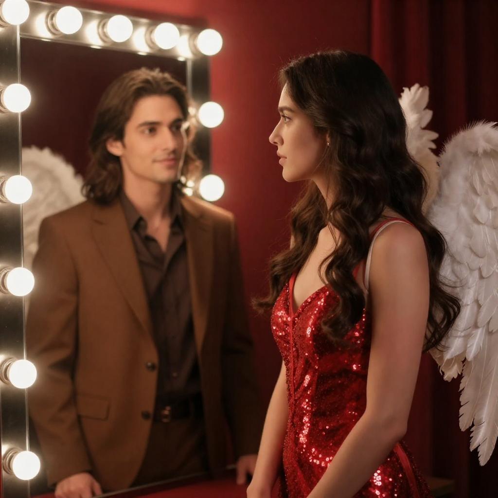 Photograph of a woman with long dark hair and angel wings, wearing a red sequined dress, standing to the right, looking at a man with long brown hair in a brown suit reflected in a mirror with round light bulbs. Red curtains in the background. Woman's face shows focus, man's face shows slight smile. Warm lighting.