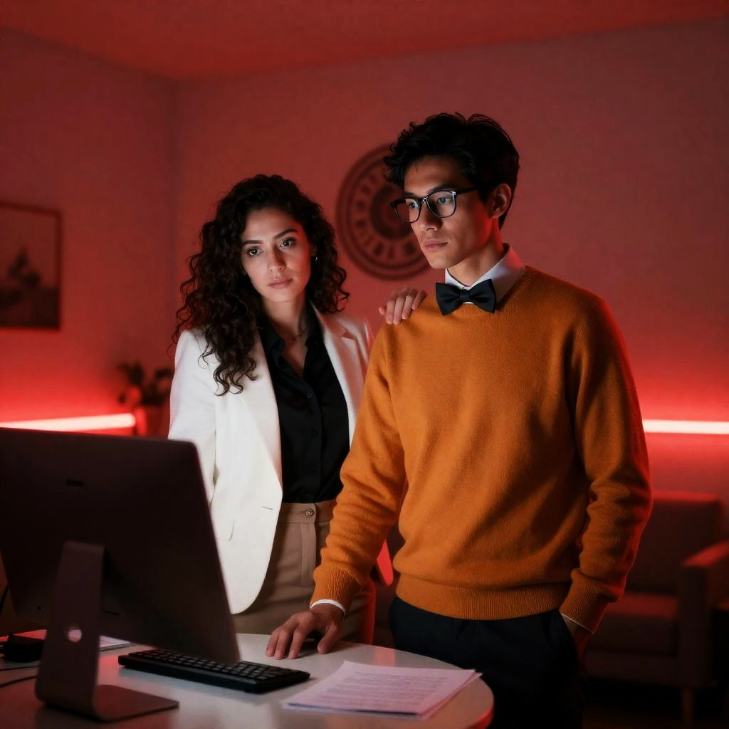 Woman Holding Dog in Red-Lit Office