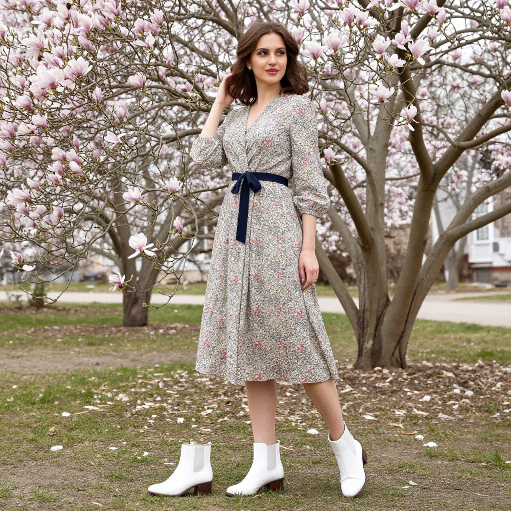 A woman in a chicwish floral-print dress and white ankle boots stands gracefully amidst a picturesque spring setting, surrounded by blossoming magnolia trees, capturing the essence of Larisa Costea's elegant style with a touch of vintage charm and high-definition detail.