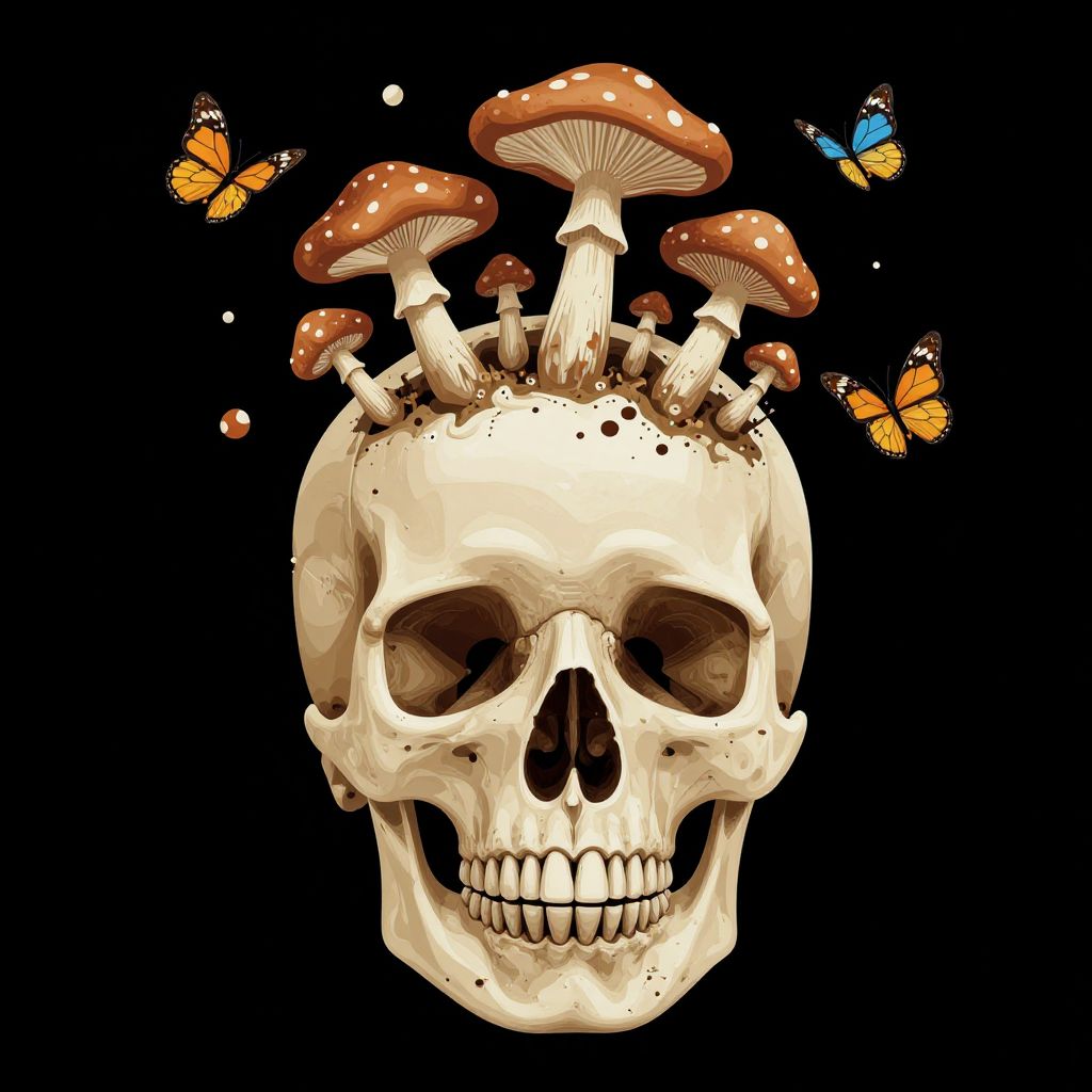 Digital artwork of a skull with brown mushrooms growing from its top, surrounded by orange butterflies, set against a black background.