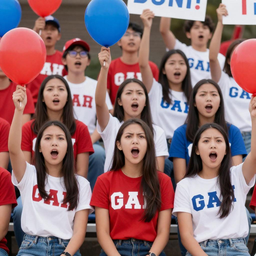 Photograph of a crowd of people wearing red, white, and blue clothing with team letters, holding balloons, and signs. Front row includes three people with intense expressions, wearing team shirts. Background shows more people cheering, wearing hats, and holding signs. Bright colors, diverse expressions, and a sense of enthusiasm.
