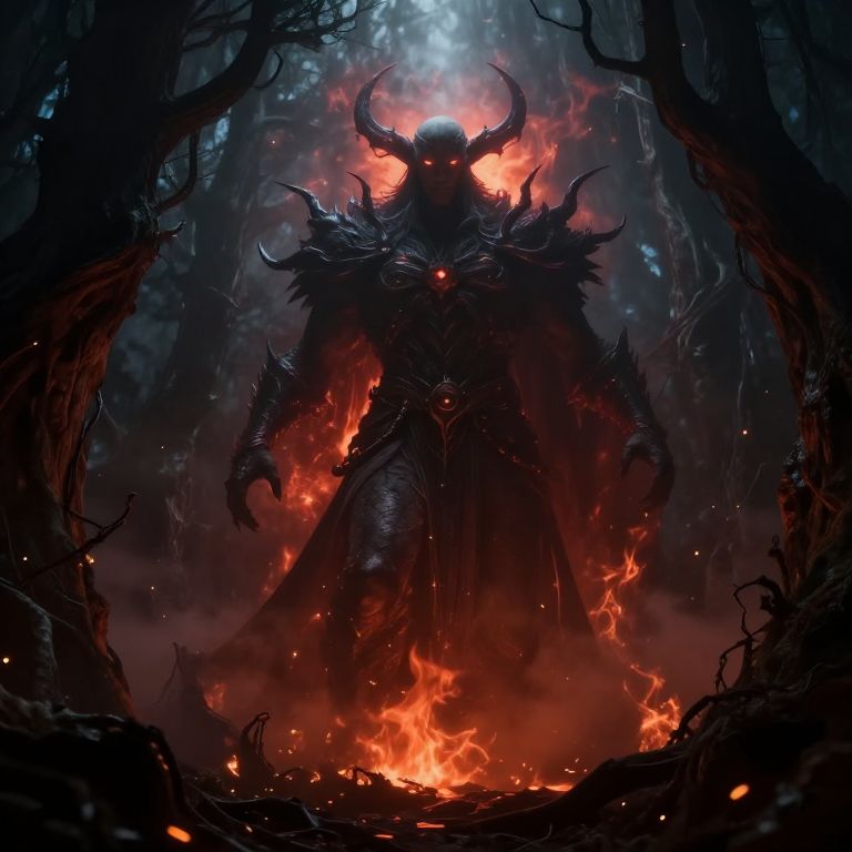 Digital fantasy artwork of a dark, horned demon with fiery red eyes, surrounded by flames and smoke in a dark, twisted forest.